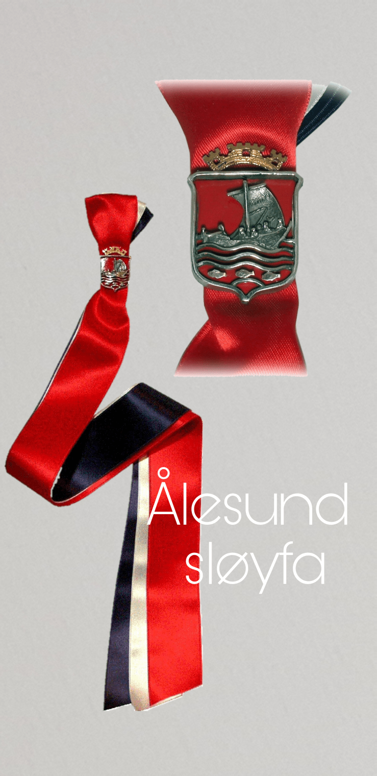 ÅLESUND-SLØYFA. Vårt unike byvåpen, laget i en 3dimensjonal utgave i 925Sølv, og med god lengde på silkebåndene